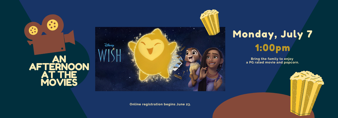 Primary tabs Upcoming List Month Week Day Add To My Calendar Print Share Program Type: Movie & Film, Summer Reading Age Group: Toddlers, Children, Tweens Please note you are looking at an event that has already happened. Registration is required for this event. Registration is no longer available for this event. Program Description Event Details Enjoy Disney's Wish, a PG rated movie, and popcorn in the library's community room.