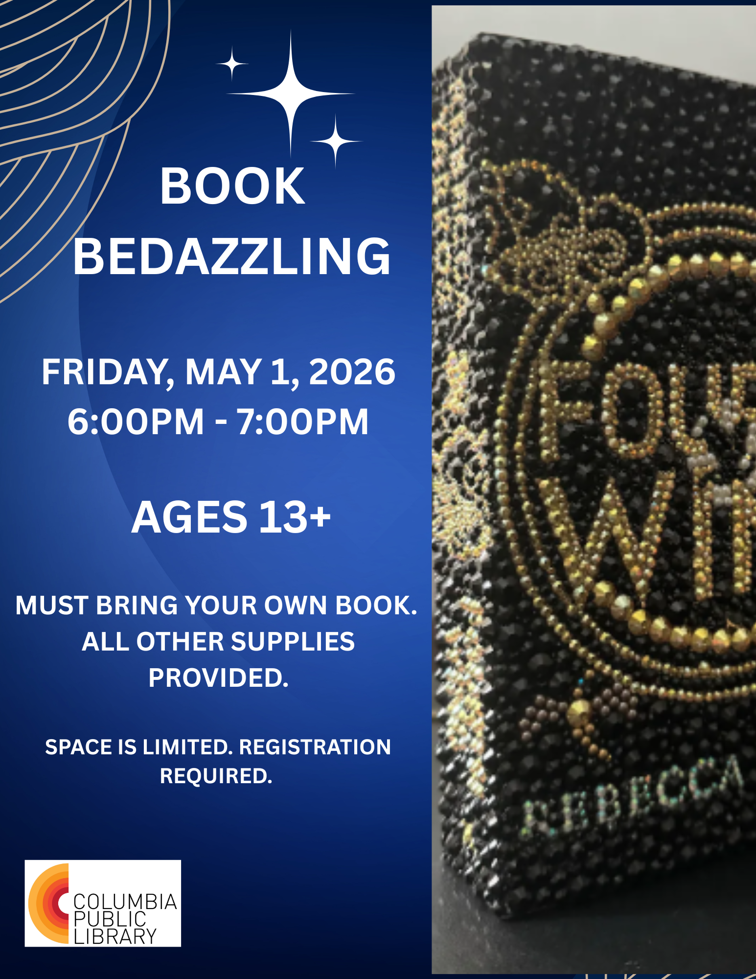 Join us for Book Bedazzling! Participants must supply their own book. All other supplies provided.