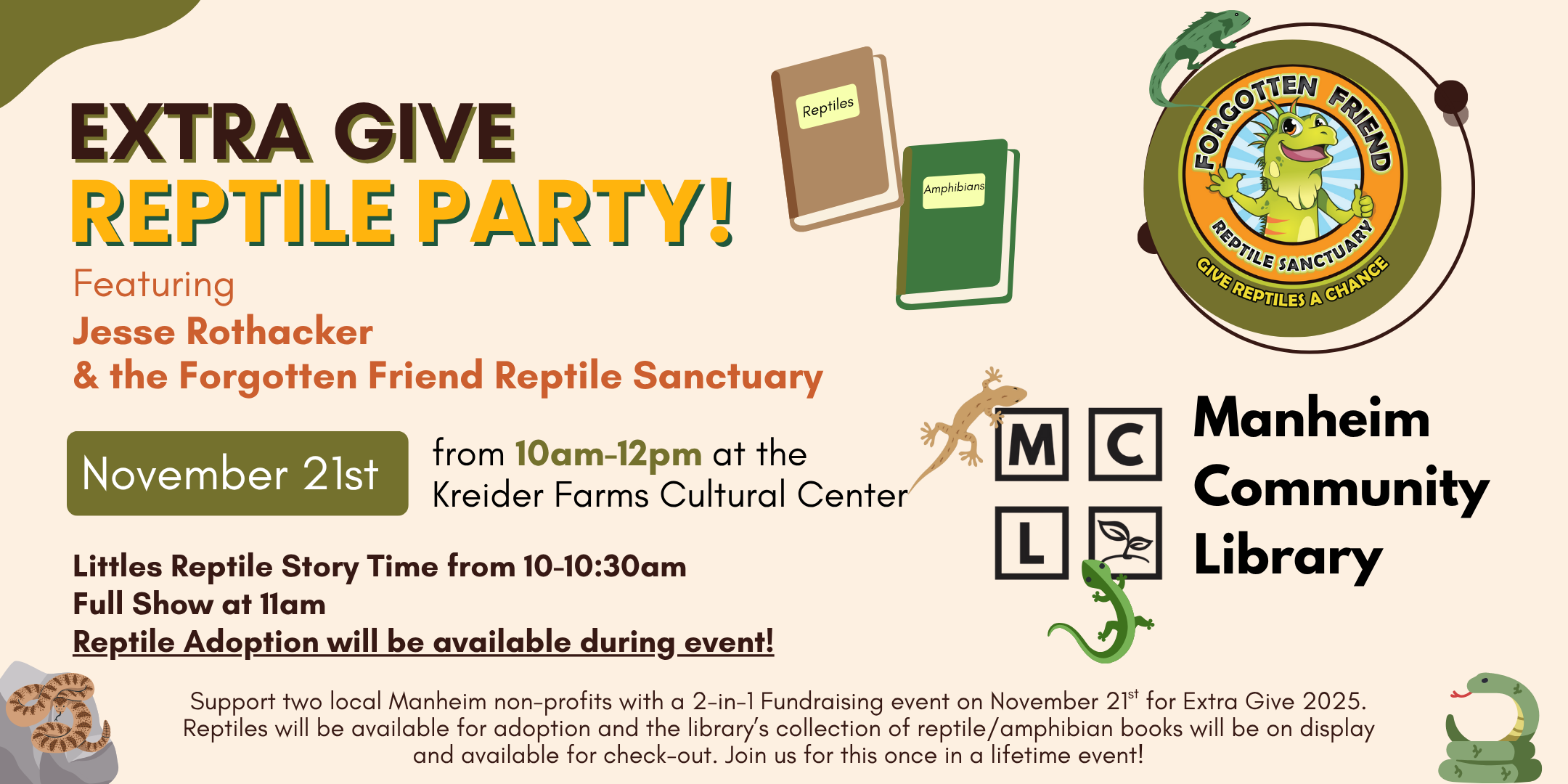 Support two local Manheim non-profits with a 2-in-1 Fundraising event on November 21st for Extra Give 2025. Reptiles will be available for adoption and the library’s collection of reptile/amphibian books will be on display and available for check-out. Join us for this once in a lifetime event!