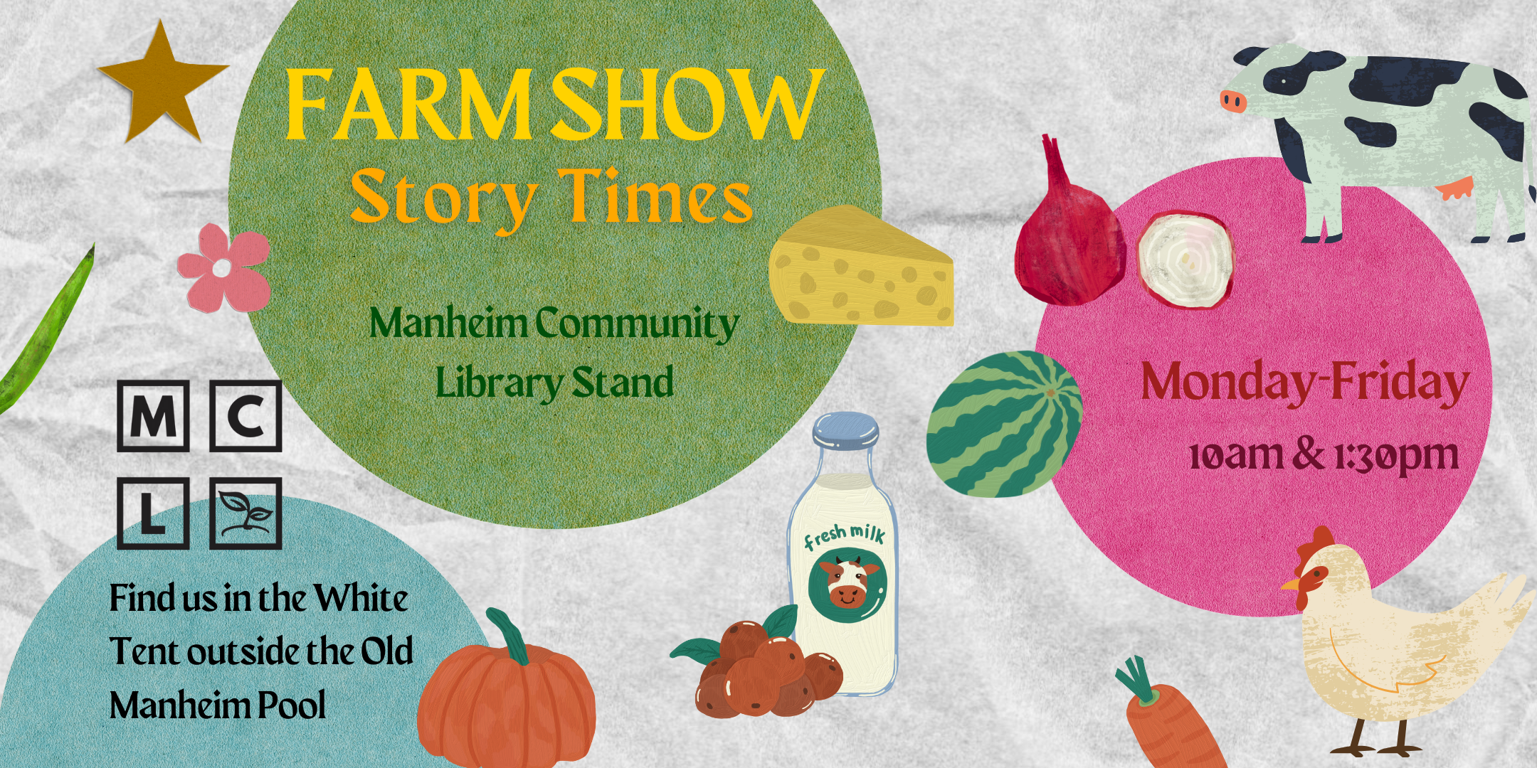 Find Miss Esther and other members of the library at our new stand location in the white tent outside the old Manheim Pool and on your way to the food stands. Story Times will occur at 10am & 1:30pm in our Story Time area! We look forward to seeing you!