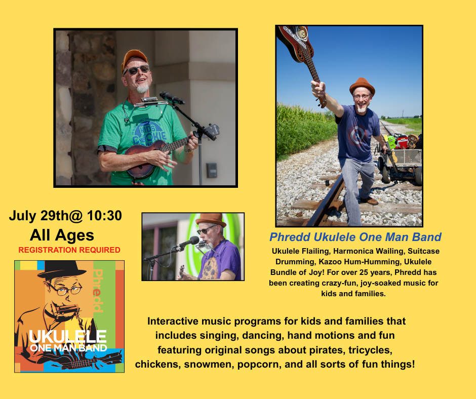 Ukulele Flailing, Harmonica Wailing, Suitcase Drumming, Kazoo Hum-Humming, Ukulele Bundle of Joy! For over 25 years, Phredd has been creating crazy-fun, joy-soaked music for kids and families.