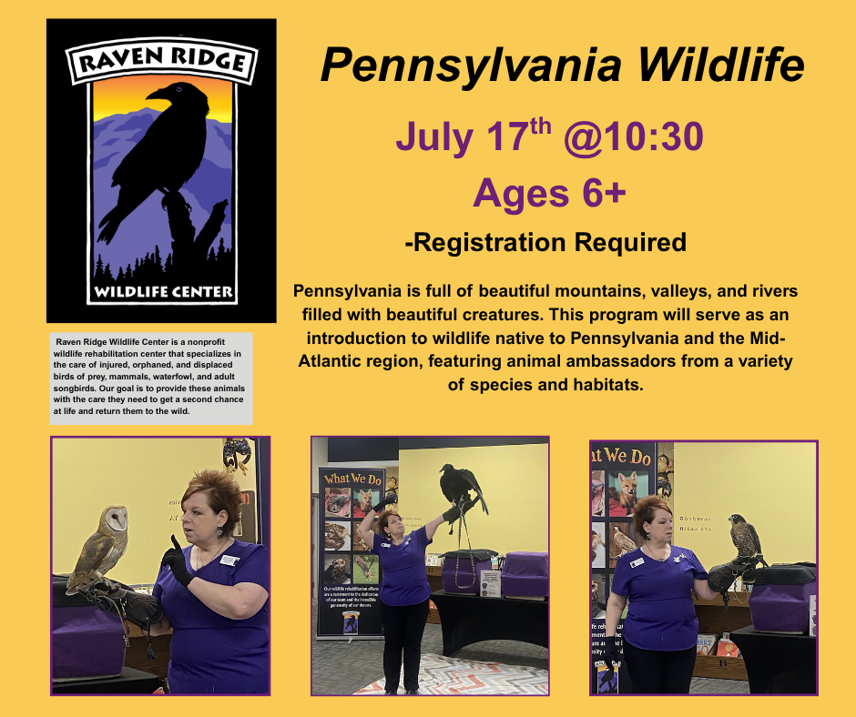 Pennsylvania is full of beautiful mountains, valleys, and rivers filled with beautiful creatures. This program will serve as an introduction to wildlife native to Pennsylvania and the Mid-Atlantic region, featuring animal ambassadors from a variety of species and habitats.