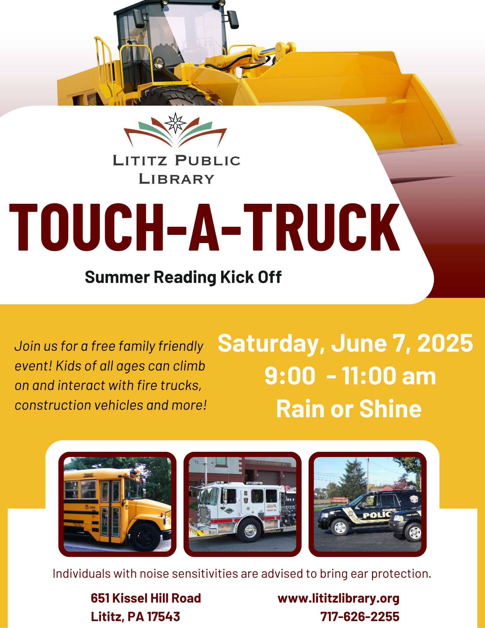 Join us for a free family friendly event! Kids of all ages can climb on and interact with fire trucks, construction vehicles and more! The event will be located in the upper parking lot at the Lititz Public Library. No registration necessary.