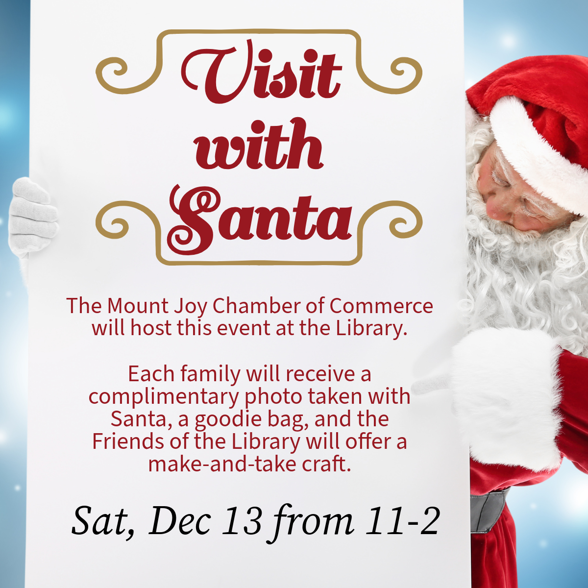 Santa Visits from 10 am until Noon. At 11 am he will read 'Twas the Night Before Christmas.